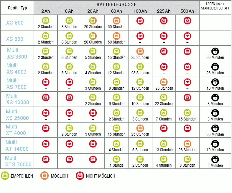 | Battery size | 28 bis 300Ah, bis zu 500Ah für Erhaltungsladung |