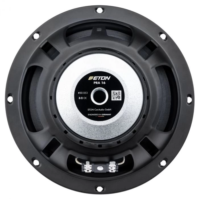 Der Komponenten Lautsprecher PRA 16 verfügt über den ETON typischen verwindungssteifen, strömungsoptimierten Metallkorb im Doppelstreben- Design.