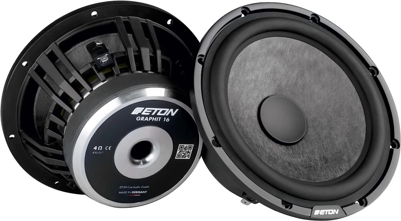 Der GRAPHIT 16 lässt sich mit dem 28 mm Hochtöner GRAPHIT 28 und dem 80 mm Mitteltöner GRAPHIT 80 perfekt ergänzen. Lieferumfang GRAPHIT 16: 2 x Tief-Mitteltöner, 2 x Alubadge „ETON Soundquality“ selbstklebend, 8 x Befestigungsschraube schwarz eloxiert mit Mutter · Techn. Daten: Nenn- / Musikbelastbarkeit: 90 W / 140 W, Impedanz: 4 Ohm, Kennschalldruck: 87 dB, Einbau-Ø: 146 mm, Einbautiefe: 68,8 mm