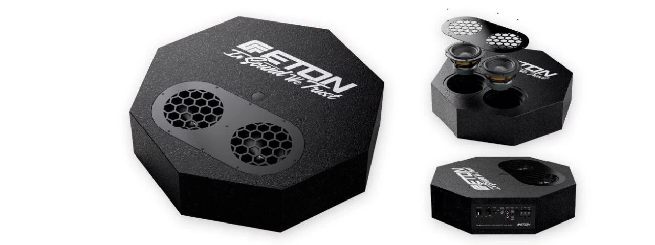 Mit nur 126 mm Gesamthöhe ist dieser extrem flach bauende Aktiv-Subwoofer von ETON ein echter Problemlöser in punkto Platz und Höhe: Der RES 5 FLAT passt auch in sehr flache Reserverad-Mulden (Allrad-Fahrzeuge, Young- und Oldtimer) und ist mit seinem integrierten 300 Watt Aktiv-Verstärkermodul ein echtes Kraftpaket. Zwei neu entwickelte, flach bauende, 2 x 130 mm (5″) Langhub-Subwoofer mit starken Ferritmagneten, luftgetrockneten Papiermembranen und verwindungssteifen Aluminium-Druckgusskörben überzeugen durch ihre hohe Belastbarkeit. Die Treiber werden durch das integrierte AM300-2 Aktivmodul mit 300 W an 2 Ohm befeuert.