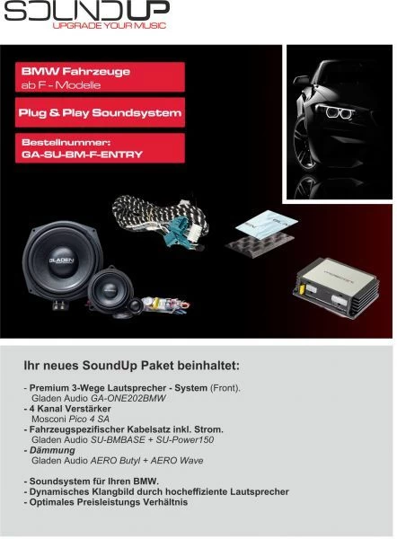 Es werden die Tür Frontlautsprecher + Untersitz-Bässe gegen das Gladen 3-Wege BMW System getauscht. Das System wird über die 4-Kanal Mosconi Endstufe angesteuert. Die Original Rear Lautsprecher laufen weiter über das Radio. Nach der Bestellung müssen Sie uns noch die Fahrzeug VIN-Nummer übermitteln. Somit kann das Bundle mit dem richten Kabelsätzen ausgeliefert werden. Nach der Installation muss über ein Laptop noch das optimale DSP-Setting aufgespielt werden.