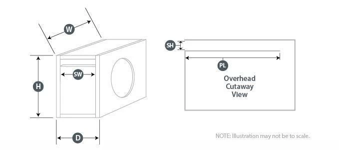 * Bei den oben aufgeführten Empfehlungen für das Gehäuse handelt es sich um Außenmaße, bei denen Material mit einer Dicke von 19 mm (19 mm) verwendet wird. Wenn Sie Material mit einer Dicke von 0,625 Zoll (16 mm) verwenden, ziehen Sie 0,25 Zoll (6) von jeder Abmessung ab. Verwenden Sie kein Material mit einer Dicke von weniger als 16 mm, da dies die Steifigkeit des Gehäuses beeinträchtigen kann.