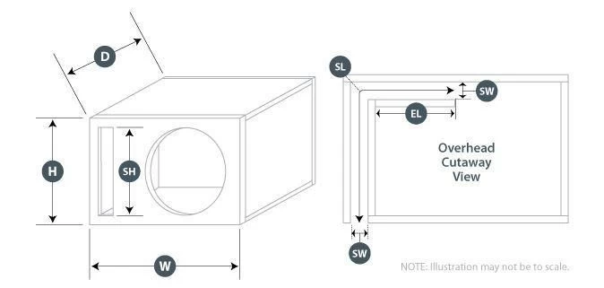 * Bei den oben aufgeführten Empfehlungen für die Gehäuse handelt es sich um Außenmaße, bei denen Material mit einer Dicke von 19 mm (19 mm) verwendet wird. Wenn Sie Material mit einer Dicke von 0,625 Zoll (16 mm) verwenden, ziehen Sie von jeder Abmessung 0,25 Zoll (6,5 mm) ab. Verwenden Sie kein Material mit einer Dicke von weniger als 16 mm, da dies die Steifigkeit des Gehäuses beeinträchtigen kann.