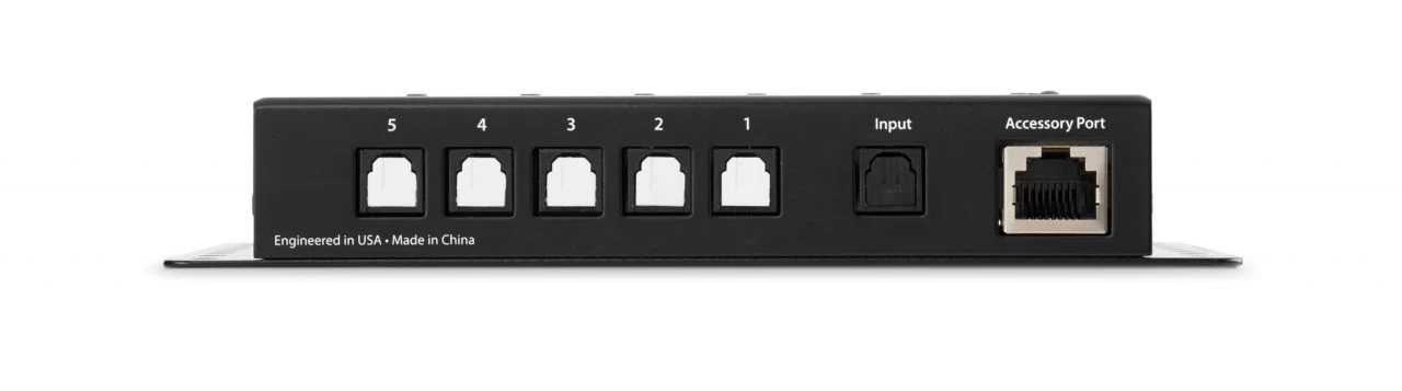 Die sekundäre Funktion des VXi-HUB besteht darin, synchrone optische digitale Audiosignale an die vernetzten Verstärker zu verteilen, wobei die Verzögerungen vermieden werden, die mit der Weitergabe digitaler Signale über eine Kette von Verstärkern verbunden sind. Der optische digitale Audioausgang einer Quelleneinheit wird direkt mit dem optischen Audioeingang des VXi-HUB verbunden, der dann über seine fünf optischen Ausgänge synchrones digitales Audio an die Verstärker verteilt. VXi-HUB verarbeitet S / PDIF-Signale mit bis zu 24 Bit / 192 kHz.