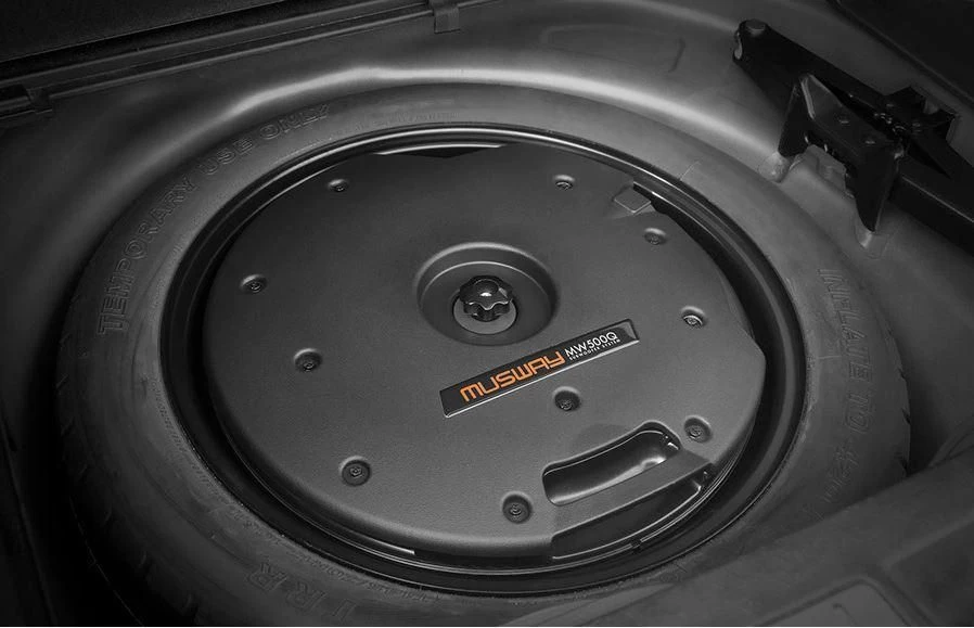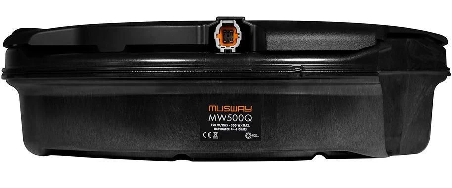 Das MW500Q Subwoofer-System ist mit einem Durchmesser von nur 41,5 cm passend für alle Felgen ab 17-Zoll. Selbst eine Montage in Not-Rädern ist bei einer Bauhöhe von gerade einmal 12,5 cm möglich. Besonders erwähnenswert ist das geringe Gewicht von nur 4,6 kg. Somit ist das MW500Q besonders gut für die Verwendung in Elektrofahrzeugen oder auch überall da geeignet , wo das Gewicht eine Rolle spielt. Das robuste Gehäuse aus ABS-Kunststoff besitzt darüber hinaus optimale Schalldämpfungseigenschaften und ist resistent gegen alle Witterungseinflüsse. Mit dem serienmäßigen Quick Connect Anschluss gestaltet sich die Verbindung zu einem kompatiblen Verstärker wie z.B. Musway M6 denkbar einfach. Selbstverständlich besteht auch die Möglichkeit andere, handelsübliche Verstärker anzuschließen. Im Lieferumfang befinden sich alle notwendigen Anschlussteile und Schrauben, um das Subwoofer-System stabil am Reserverad zu befestigen.
